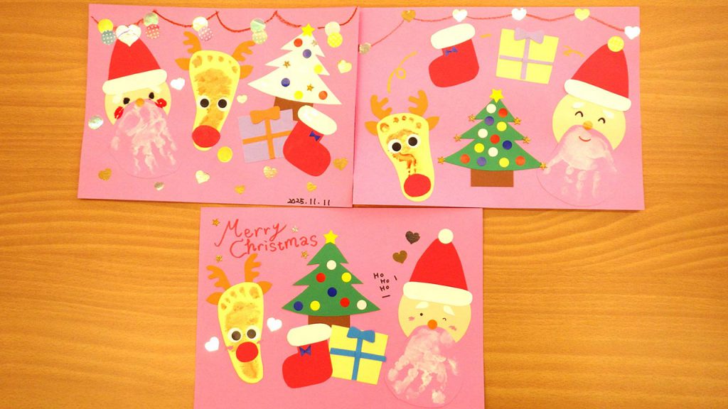 手形足形がサンタさんとトナカイに変身。クリスマス装飾を施してできあがり!!