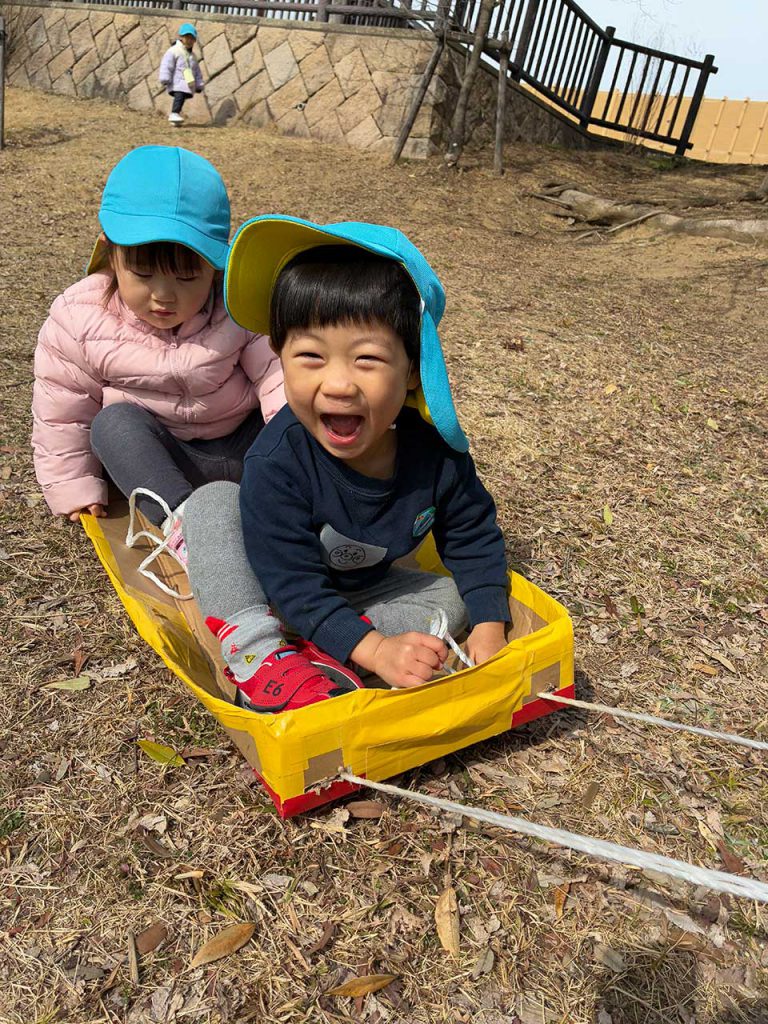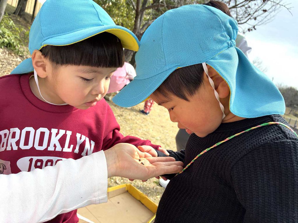 ぽかぽかとあたたかく春の訪れを感じながらお散歩に出かける日が多くなりました。風のあたたかさや、日差しの心地よさを肌で感じ、公園に着くとダンゴムシや蝶々に出会うこともあり、子ども達は大喜びです‼ シャボン玉を追いかけたり、芝生の上を段ボールソリに乗って遊んだり、思いっきり走ったり、元気いっぱい楽しんでいます。保育園では、大型ブロックで遊んだり粘土で色々な物作りをして想像豊かに遊んでいます。色々な表情を見せてくれる子ども達はそれぞれに自分がしたい遊びを楽しんでくれています。3月にはみんなで観察していたブロッコリーが大きく育ち、収穫をしました。大きく美味しそうに育ったブロッコリ―を見て色や匂いを感じることができました。園生活の中で見たり触れたりしながらたくさんのことを感じ取ってほしいと思っています。