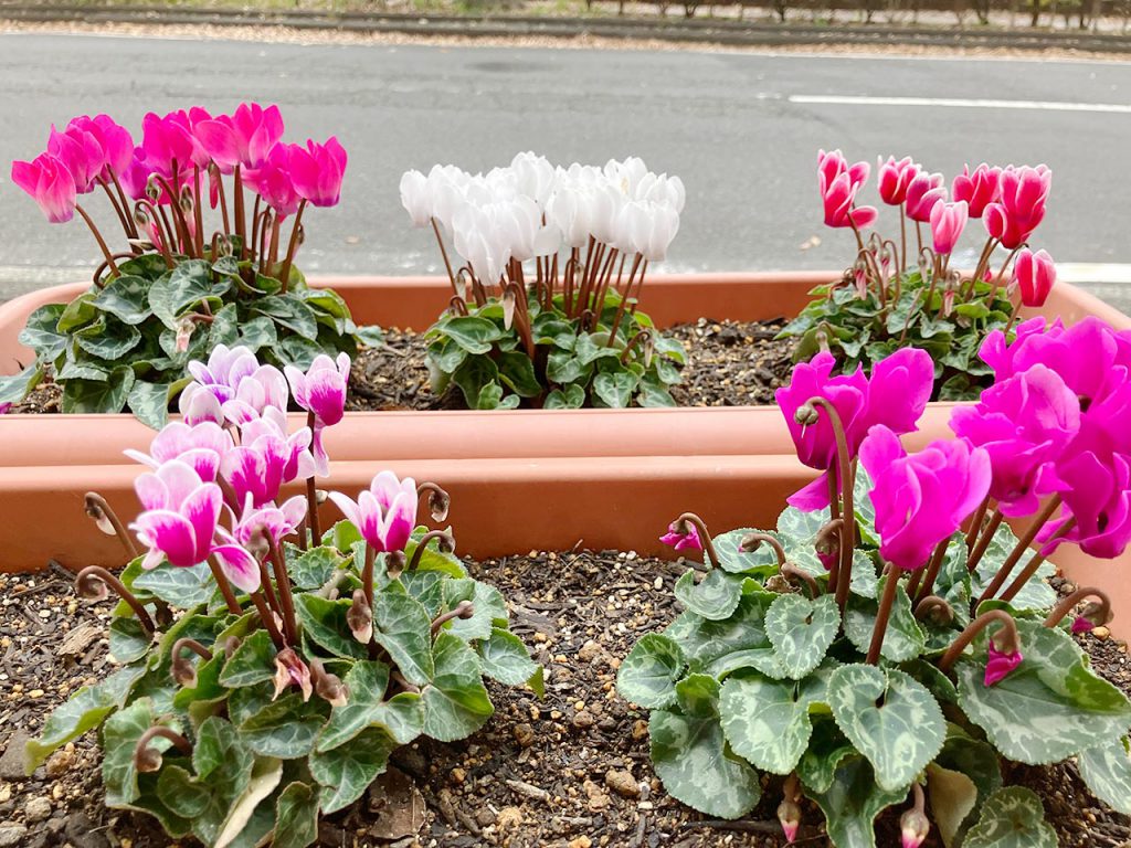 玄関先のガーデンシクラメンが今日も子どもたちをお出迎え