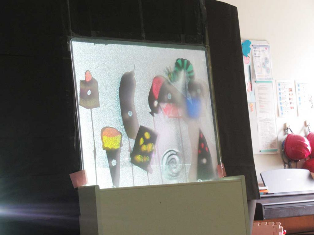 9月の誕生会では、職員手作りの「はらぺこあおむし」の影絵をみんなで鑑賞しました。絵本で見るのとはまた違う光を使った演出に「わぁ♪」という声が子どもたちからも上がっていました。
