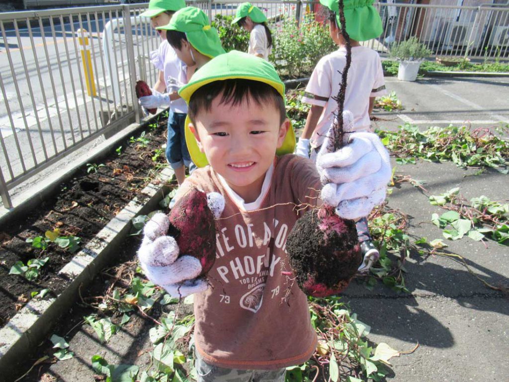 10月中旬、年長めろん組さんがお芋掘りをしました。保育園の前庭で育てていたさつまいもが収穫の時期を迎えました。まずは、夏の間に成長したツルをみんなで引っ張り抜きました。そのあと、土を掘りながらお芋を探していくと出てくる出てくるお芋たち!泥んこになりながらもとっても楽しそうなめろん組さんでした。