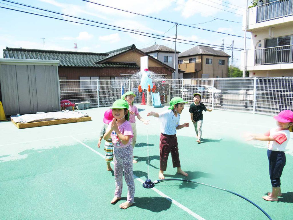 9月になっても暑い日が続きますね。保育園では今年イルカさんやロケット型のスプリンクラーが大流行しています。水圧で上がったり下がったりするロケットから水が出てきたり、イルカさんの頭から縦横無尽に出る水にキャッキャッ♪と大騒ぎする子どもたち。まだまだ夏が終わらない保育園です。