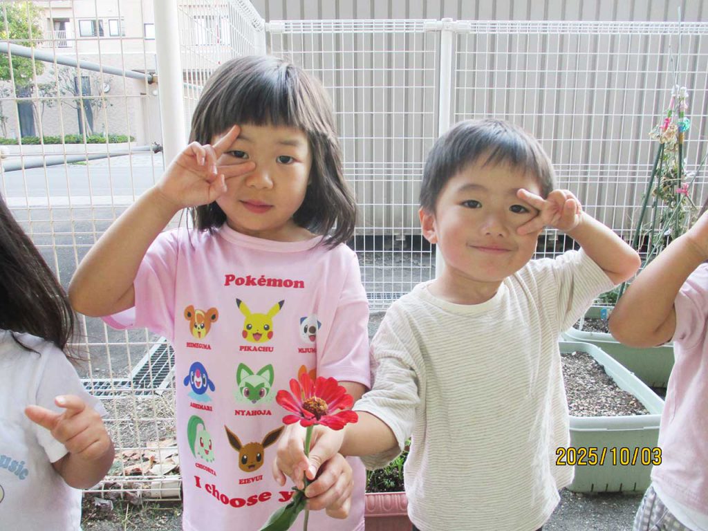 保育園の園庭では、夏の間元気に育ってくれた野菜やお花たちが収穫の時期を迎えました。