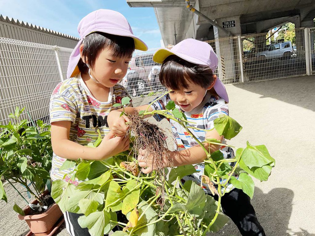 年長さんは今年さつまいもを育てました。土のなかは見えないので葉の様子やこまめに水をあげるなど、収穫を心待ちにしていました。いよいよ芋掘りの日!「うんとこしょ、どっこいしょ!」と大きな掛け声でかわいらしいお芋がいくつもとれて大喜びの子どもたちでした。給食さんに美味しいふかし芋にしてもらい、一粒残さず頂きましたよ。