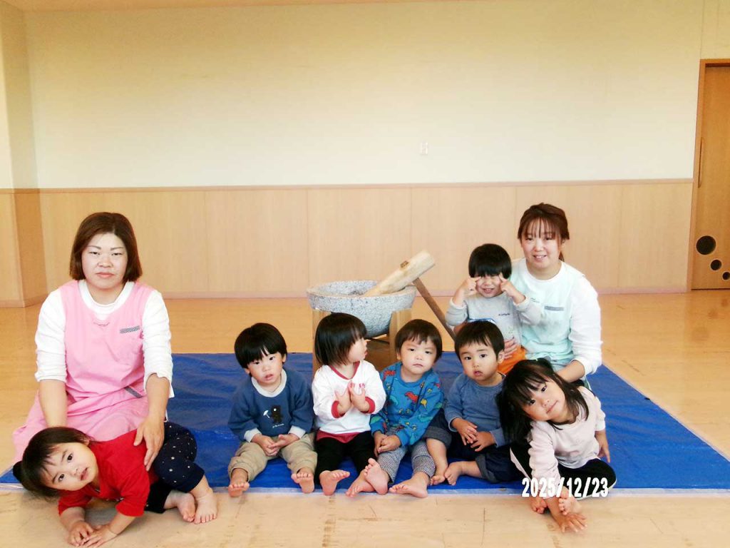 保育園、年末最後の行事では「おもちつき」を行いました。「よいしょー!」の掛け声に合わせて杵を先生と持ちお餅をつきを楽しみました。