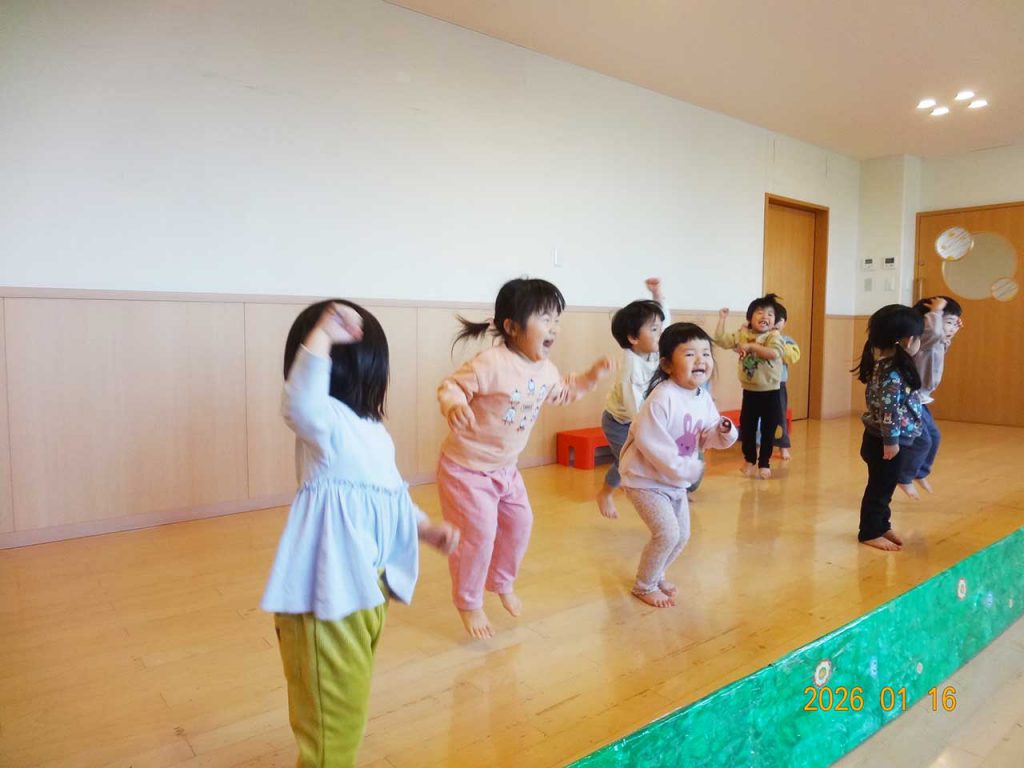 1月の末に乳児クラスによる「親子でふれあい 生活発表会」が行われました。本番では泣いてしまうお子様もいましたが、この一年で成長した姿を発表することが出来ました。保護者様のご理解・ご協力ありがとうございました。