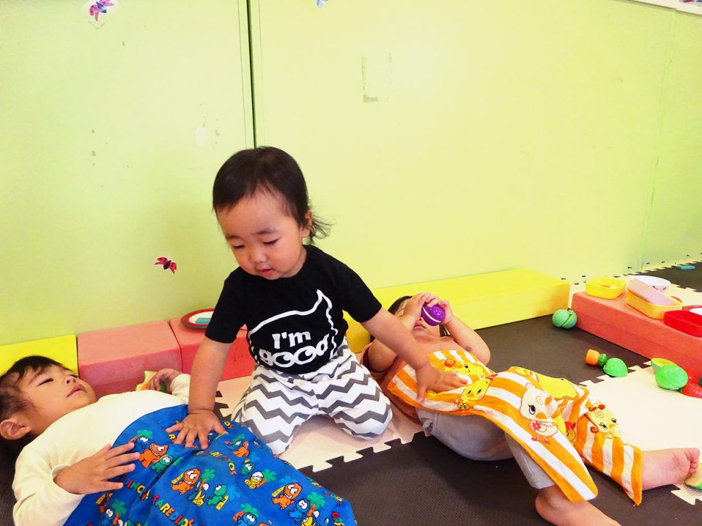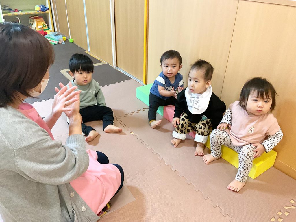 「始めるよ」と声を掛け、♪ちょちちょちあわわ、かいぐりかいぐりとっとのめ♪と歌い始めると、子ども達はよちよちと集まって来ます。