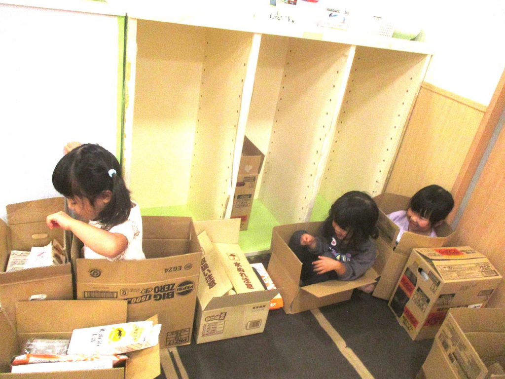 その中から普段使う事のない段ボールを選び、まずは中に入ってみよう!と、仲良し3人組。