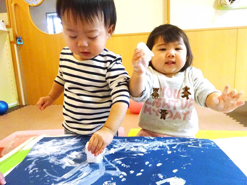 雪で遊んだ後で、絵の具で遊んでみました。手が汚れるのも気にせず、スポンジでポンポン。ごしごし擦るのも面白かったよ。