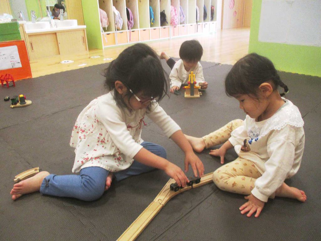 「一緒に作ろう!」と誘い合いながら線路を繋げています。「こっちにつなげてみる?」{いいよ」とおしゃべりしながら上手に指先を使って繋げていました。この後は長い長い線路が出来上がっていました。