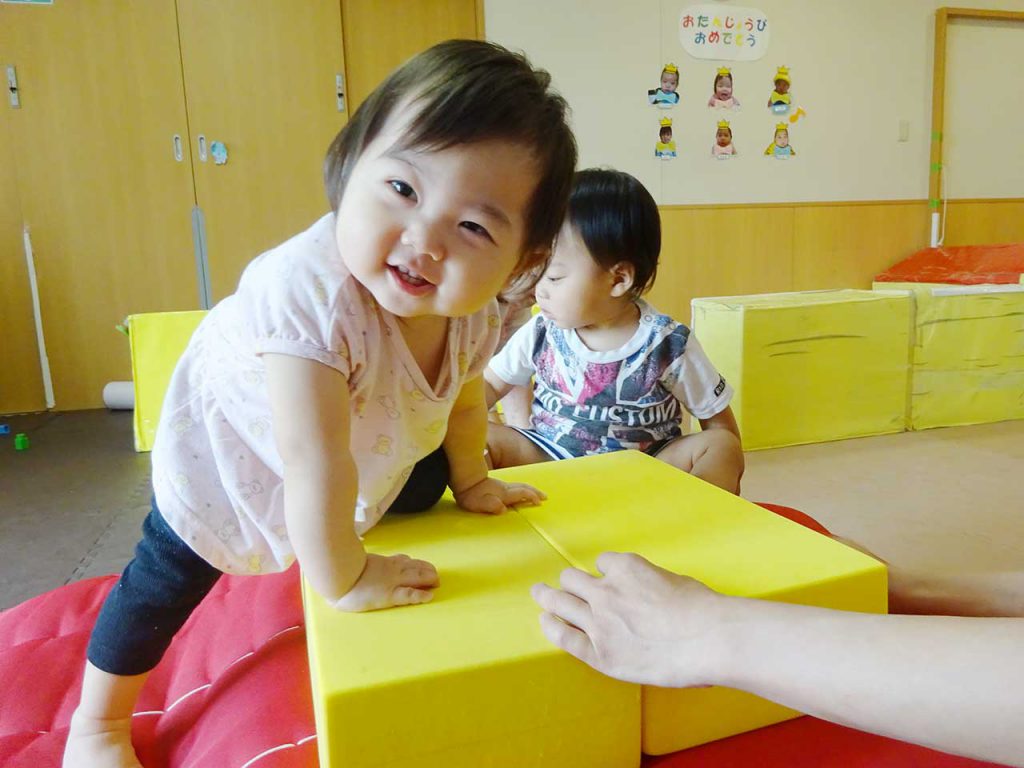 1人で登れるようになった事が嬉しくて、マットのお山を登ったり降りたりを楽しんでいます。