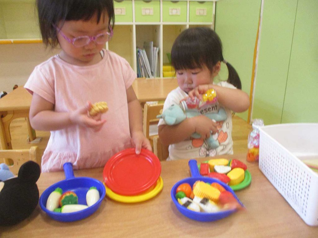 「私はお料理作ってるのよ」とおままごとを楽しんでいます。