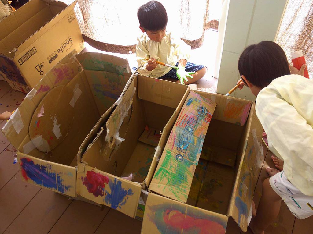 自由保育に向かって、みんなで取り組んでいるところです。そこで環境設定として、大きな段ボールを設置してみました。年長さんを中心に、車や船、様々な物の形が出来上がりました。そこで今度は、絵の具で色をつけてみようということになり、園のテラスで行いました。作った作品に色を塗っていたはずが、終わった時には自分の体にも色がたくさんついていた事は、いうまでもありません。子どもたちみんな、とても楽しそうで、またやりたいという声があがったいました。