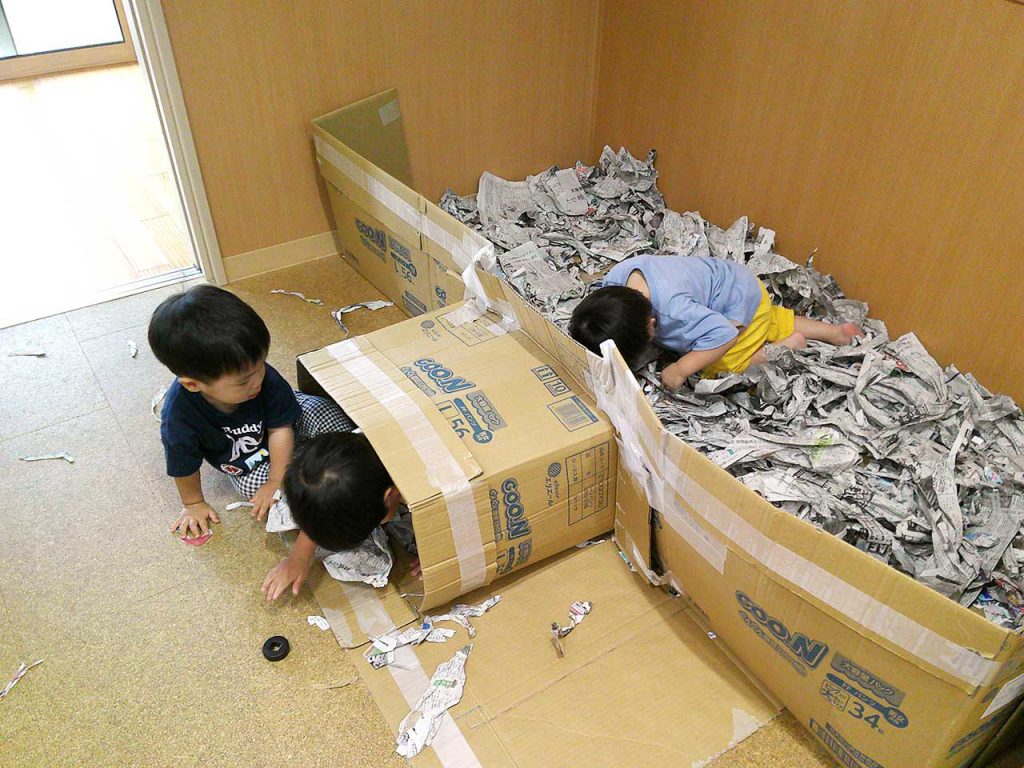 1歳児の部屋に、新聞遊びコーナーを設置しました。みんなその場所が大好きで、合同保育になった時は、以上児さんもそこに入って大はしゃぎです。トンネルから入れなかった子どもたちも、何回かチャレンジすることで入れるようになりました。その後のお部屋は・・・子どもたちが楽しんだ後がたくさん残っていました。