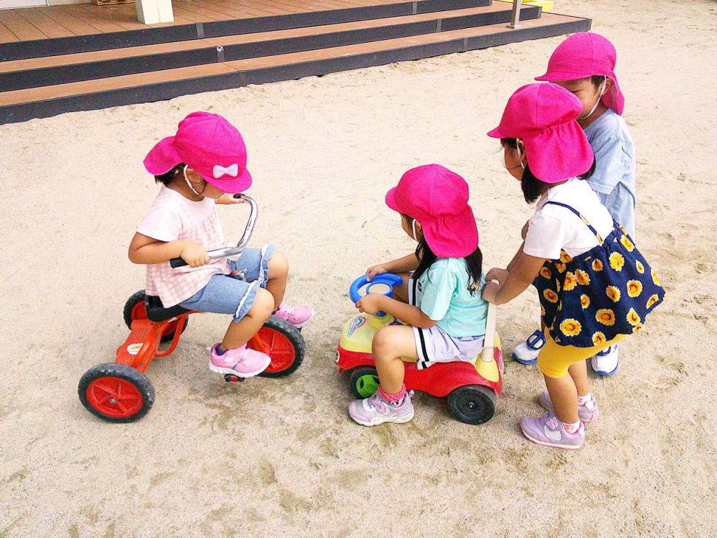 暑すぎた夏から少しずつ風の心地よさを感じられるようになってきました。子どもたちの戸外遊びが活発になってきました。お友だちと仲良く三輪車に乗ったり、車を押してあげたりと、思い思いに遊びを楽しんでいます。これからもっと過ごしやすくなって、たくさんお外で遊べたらいいですね!