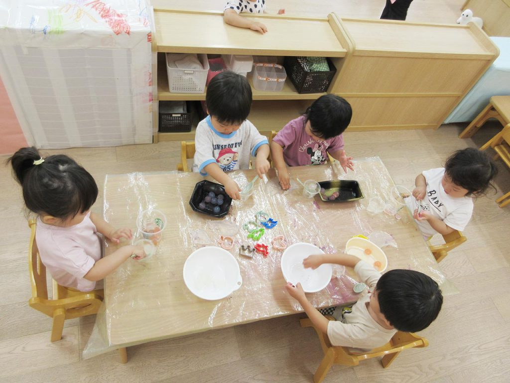寒天遊びをしました。「冷たーい」と感触を楽しみながら、子ども同士で顔を見合わせて遊んでいました。