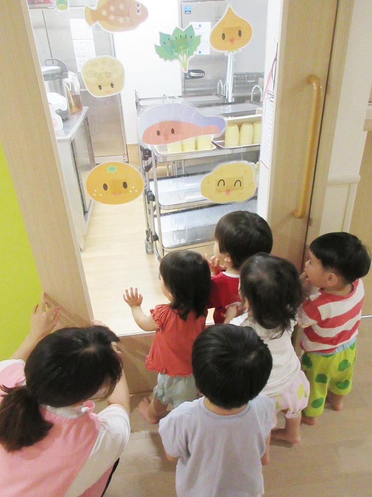 食べることが大好きなりす組さん。給食を作ってくれている様子を見ています。