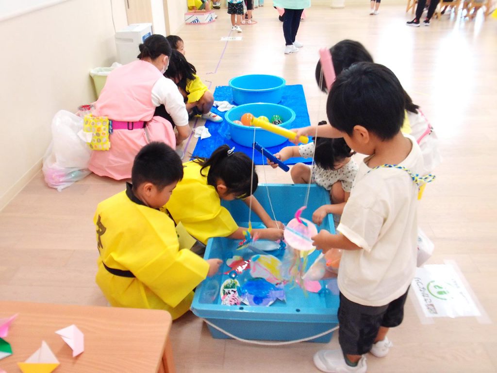 夏祭りに参加しました。5歳児がお店屋さんになって、ヨーヨー釣りや食べ物コーナーなど、夏祭りの雰囲気を存分に味わいました。