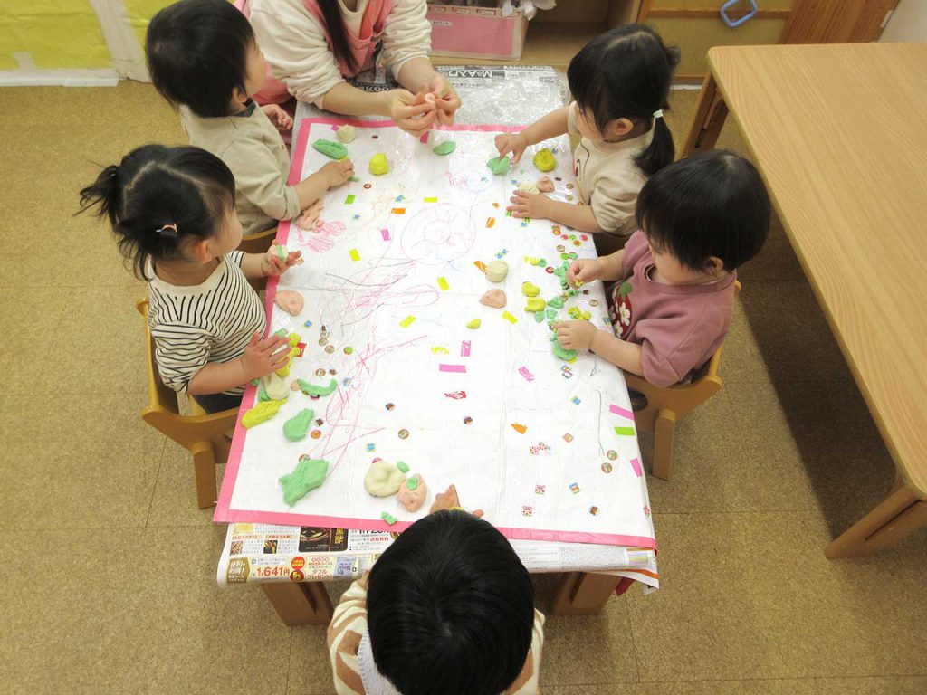 春らしい菱餅色やたんぽぽ色の小麦粉粘土で遊びました。こねたり千切ったり感触を楽しんでいます。