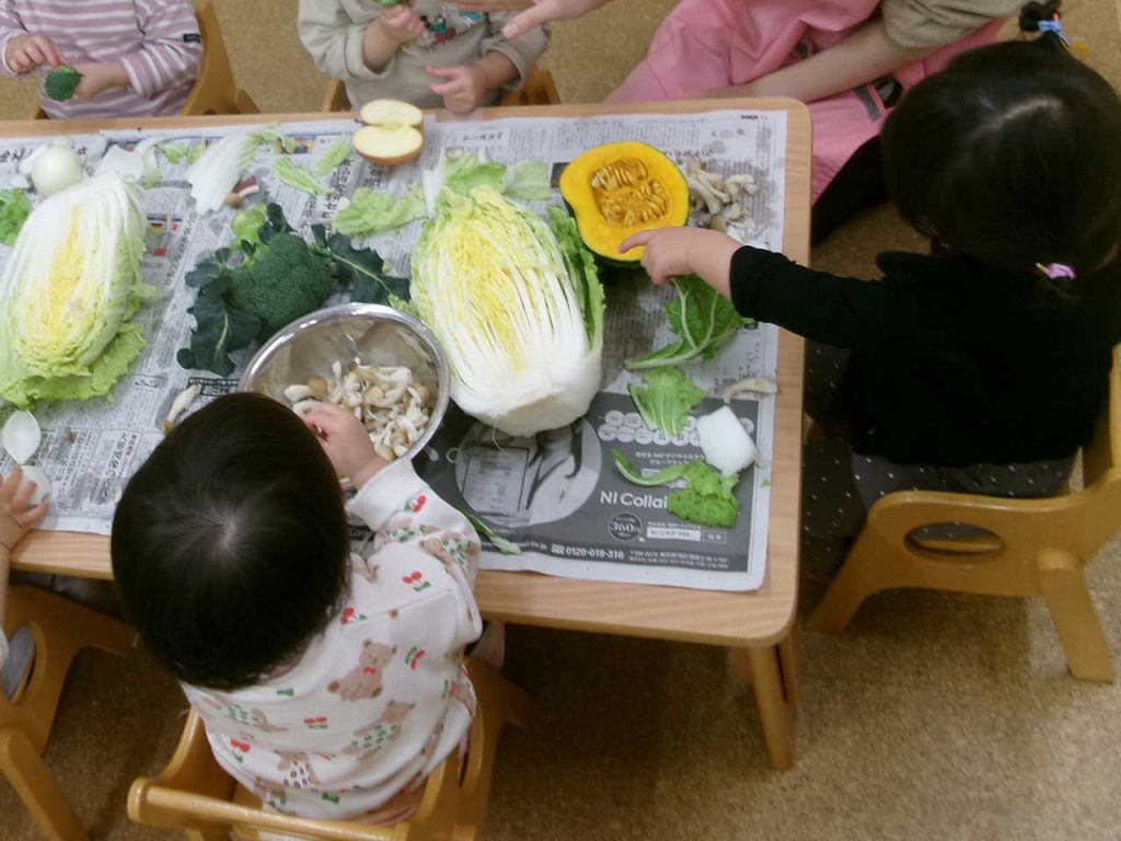 食育では白菜・ねぎ・ブロッコリーなど、いろんな種類のお野菜を見たり触ったりして、感触遊びを楽しみました。いつもより給食も沢山食べました。