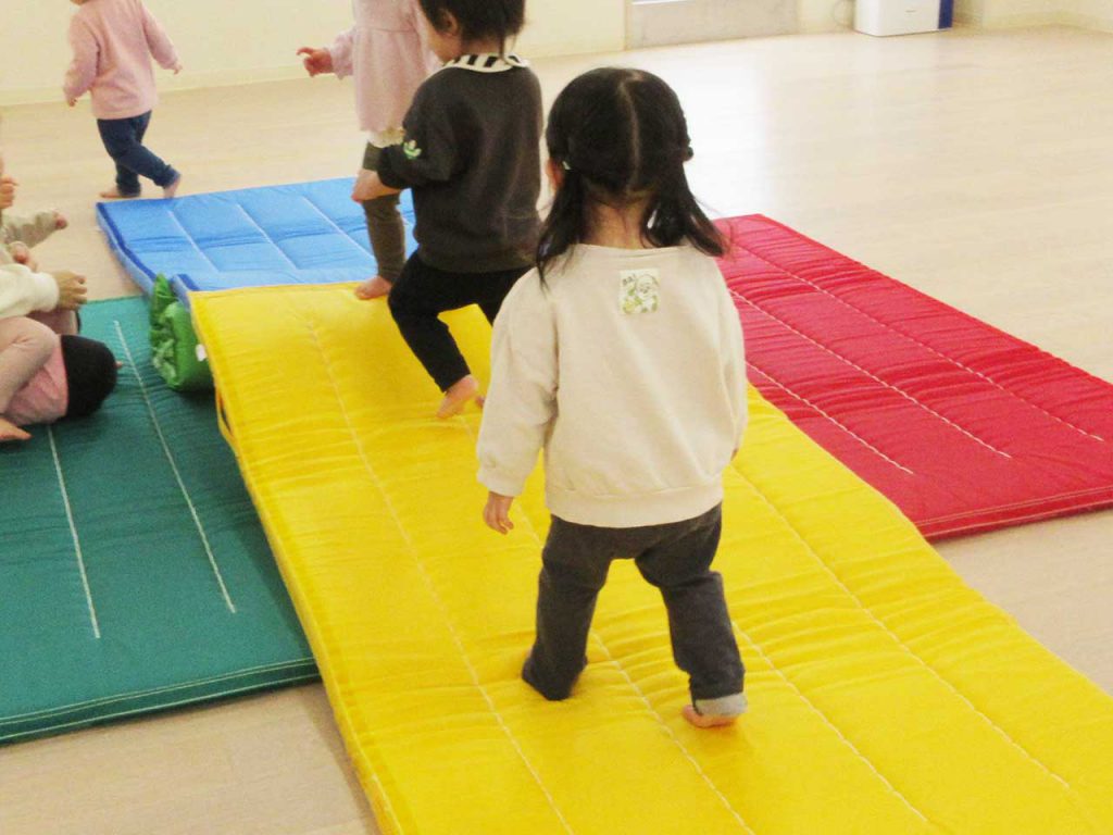 マットや跳び箱で坂道を作ると、歩いて上り下りしたり、滑り台のように滑って楽しんでいました。