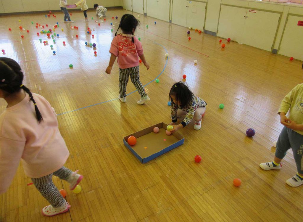 広いホールで存分カラーボールで遊びました。お片付けも楽しみながらできるように、ボール集めゲームにしましたよ。