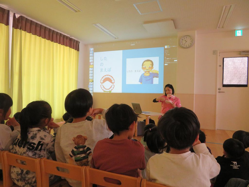 少し前になりますが10月末には「歯のお話の会」やハロウィンを行い、子どもたちが楽しみながら学びや交流を深める時間となりました。歯のお話の会では園医さんに来ていただき、正しい歯みがきの仕方と鼻呼吸の大切さを教えていただきました。きらきら星の歌に合わせて口を大きく動かす「あいうべ体操」は、みんなで実際に動きを真似しながら挑戦しました!この体操は口呼吸から鼻呼吸へ改善したり、舌を強くしたりする効果があるそうです。毎日取り組むことでインフルエンザや風邪などの感染症予防にもつながるそうなのでお家でも一緒にしてみてくださいね。