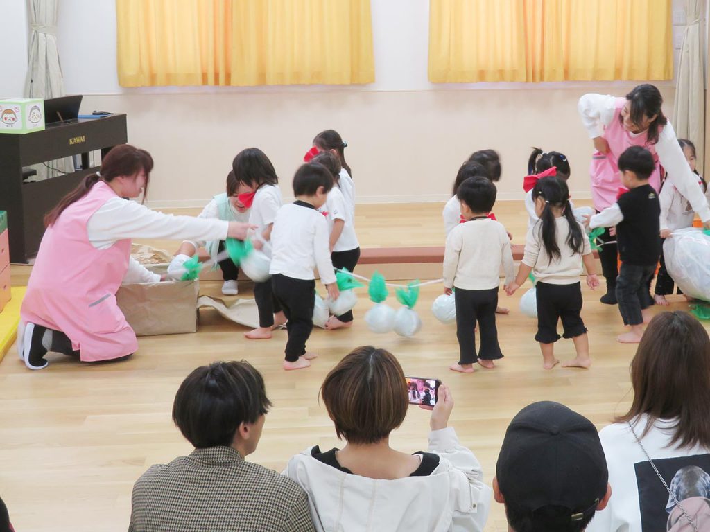 11月1日には3歳未満児さんのお楽しみ参観日がありました。普段とは違う雰囲気に少しドキドキしながらも、名前を呼ばれて返事をしたり、音楽に合わせて体を動かしたりと、頑張っていた子どもたち。保護者の方の温かい視線や拍手に包まれ、次第に表情もほぐれ、自分らしく楽しむ姿が見られました。