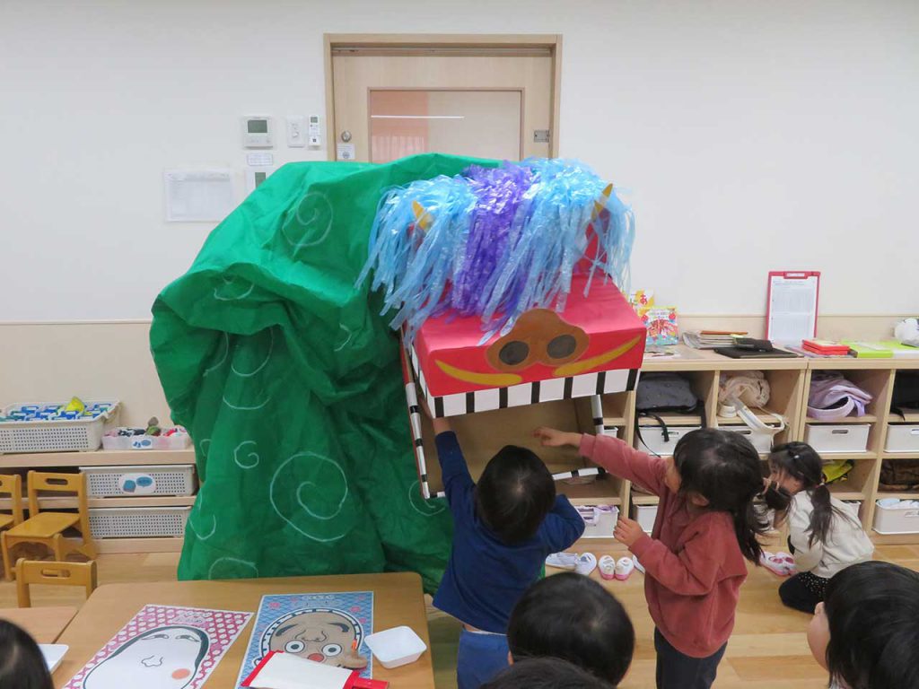 1月は新しい年を迎え、園では新年お楽しみ会を行いました。会では園長先生と主任先生が扮する獅子舞が登場しました。突然現れた獅子舞に驚きながらも、「頭を噛んでもらうと元気に過ごせるんだよ」と聞き、順番に近づいていく子どもたち。少しドキドキしながら頭を噛んでもらうと、ほっとした表情やうれしそうな笑顔が見られ、新年ならではの楽しいひとときとなりました。新年お楽しみ会の後も、各クラスではコマ回しや福笑い、かるたなど日本の伝統的な遊びに親しみ、笑顔あふれる時間を過ごしています。