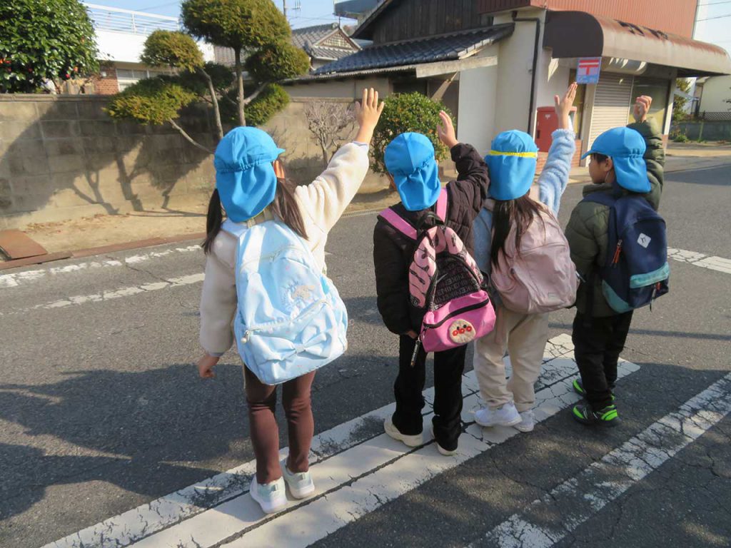 また、春から小学生になる5歳児さんは、生活安全課の方や警察官の方に付き添っていただき、実際に園の外にある横断歩道を渡る経験をしました。これまでに習った「手をあげる」「右・左をよく見る」といった約束を一つひとつ思い出しながら、落ち着いて歩く姿が見られました。学んできたことをしっかりと身につけている様子に成長を感じる時間となりました。