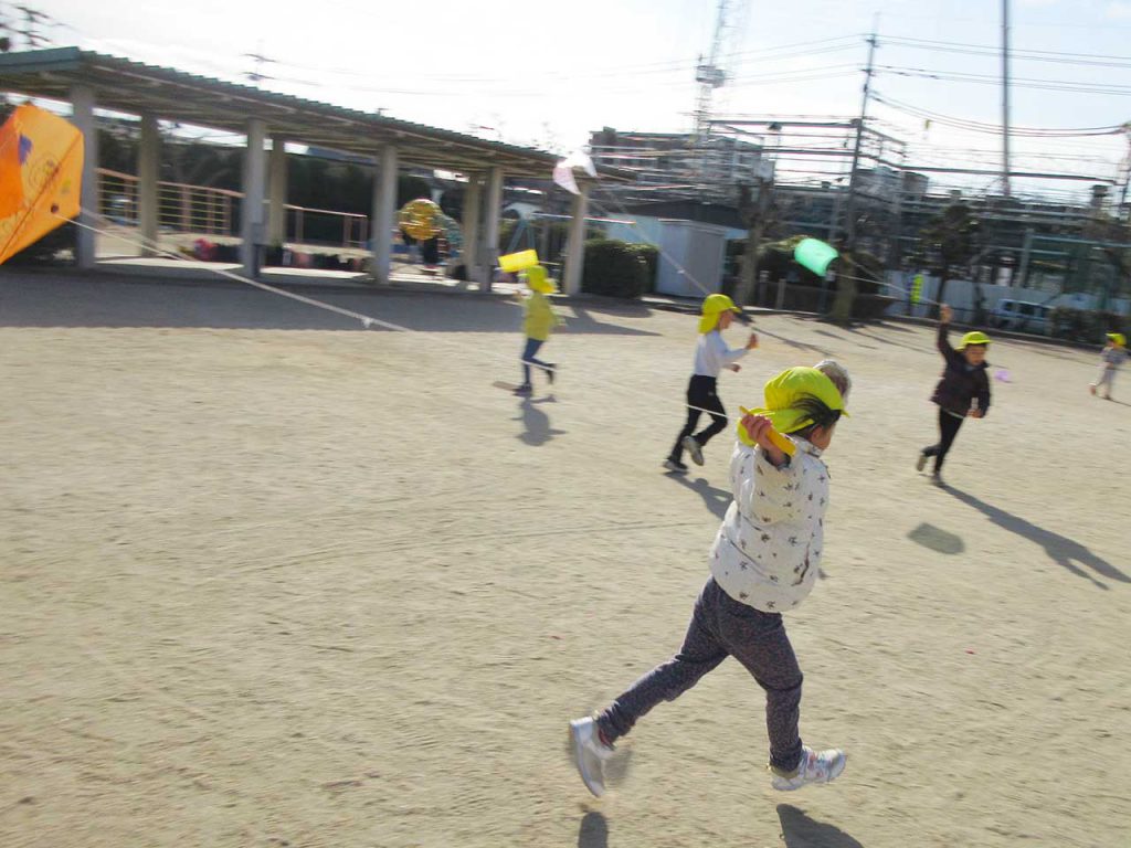 2月は、季節ならではの行事を楽しみました。3歳以上児さんは、自分たちで思い思いに作った凧を手に戸外へ。風を感じながら一生懸命走り、空高く舞い上がる凧を見上げては歓声をあげていました。友だちと「上がったよ!」「見て見て!」と声をかけ合う姿も微笑ましく、冬空に子どもたちの笑顔が広がるひとときとなりました。