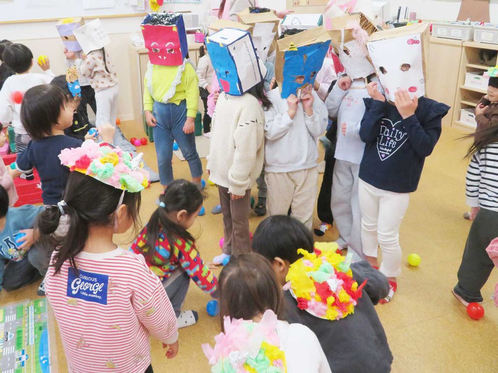 節分ではそれぞれの年齢に合わせた取り組みを行いました。今年は大人の鬼は登場せず、年長さんが小さなお友だちのクラスへ鬼役として訪れ、「鬼は外、福は内」と元気な声を届けながら、優しさも忘れない姿に成長を感じました。3、4歳児さんは多目的室で節分の由来を聞いた後、お互いに鬼になって豆まきごっこに挑戦。楽しみながら日本の行事に親しむ時間となりました。