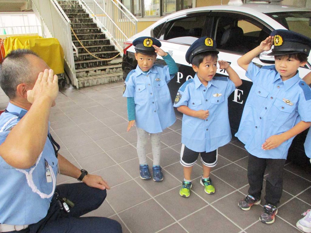 交通安全教室でお巡りさんに交通ルールを教わったよ。パトカーの前で「ハイ!ポーズ!」