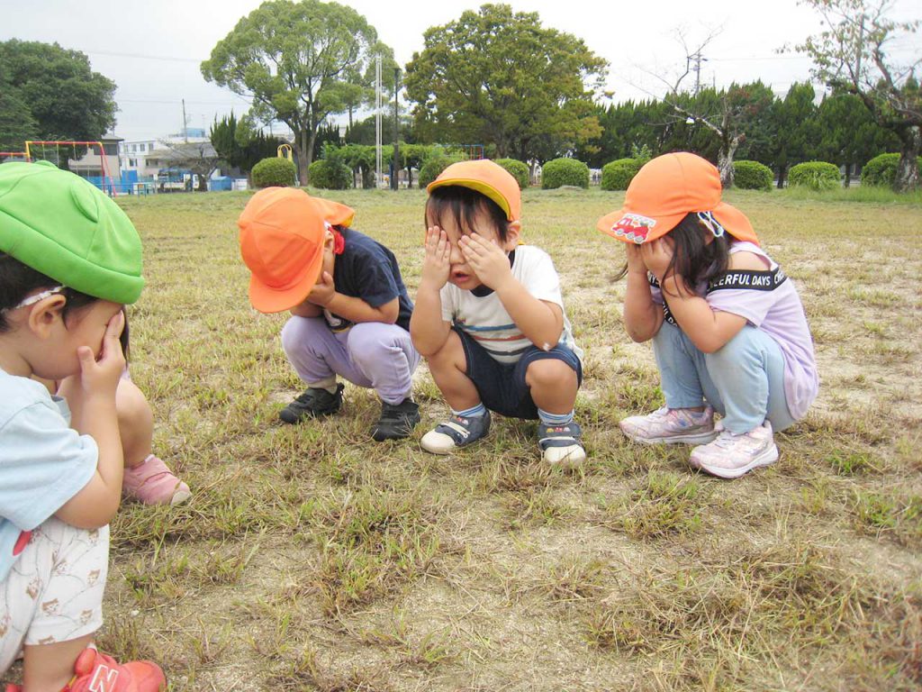 夏はとても暑く、秋はいつ来るのかといった感じでしたが、あれよあれよという間に季節は進み、一気に服装が長袖に替わってきました。朝、子どもたちは「さむ~っ」と登園してきて、肌で季節の変化を感じ取っているようです。とはいっても、子どもたちは元気いっぱいで、今年の夏は、暑くて外に出られなかったことも多かったので、外に出られる日は外に出て体を思いっきり動かして楽しんでいます。いろんなクラスが外に出ているので、学年を越えた関わりも自然と増えてきています。年上・年下関係なく、お互いに声を掛け合い、遊びが始まり楽しそうな声が聞こえてきます。