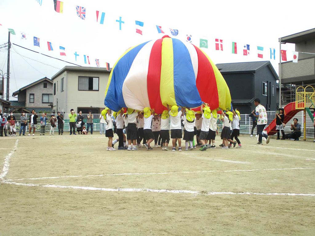 運動会は子どもたちにとって、お互いに刺激を受けていました。自分たちの演目ではなくても真剣に見て応援したり、乳児さんでは年中組のバルーンに一緒にやらせてもらったのが楽しかったようで、保育室内でポリ袋をくっつけた即席バルーンでバルーンごっこをしたり、運動会が終わった後も運動会の歌や体操が大好きで「やりたい!」と何度も踊っています。幼児組も当日緊張の中頑張ったことと、たくさんの拍手と褒めてもらえたことで、自信に繋がり、一回りも二回りも大きくなっているようです。