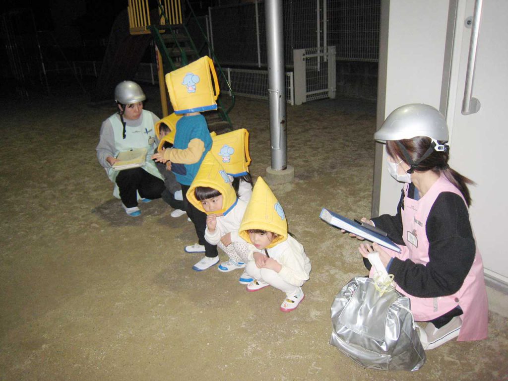 今回は合同保育中の避難訓練をしたよ。暗い中で避難滑り台は少怖しかったけど、がんばったね