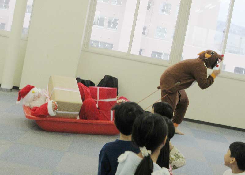 12月25日クリスマス会が行われました。クリスマスの歌をうたったり、お話を聞いたり、サンタさんとトナカイさんも来てくれました。おもちゃのプレゼントも届けられ、良い子のみんなは大喜びしていました。