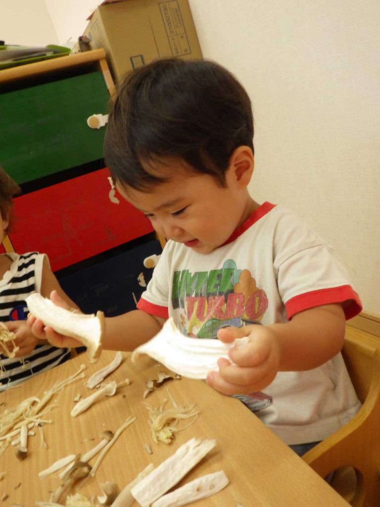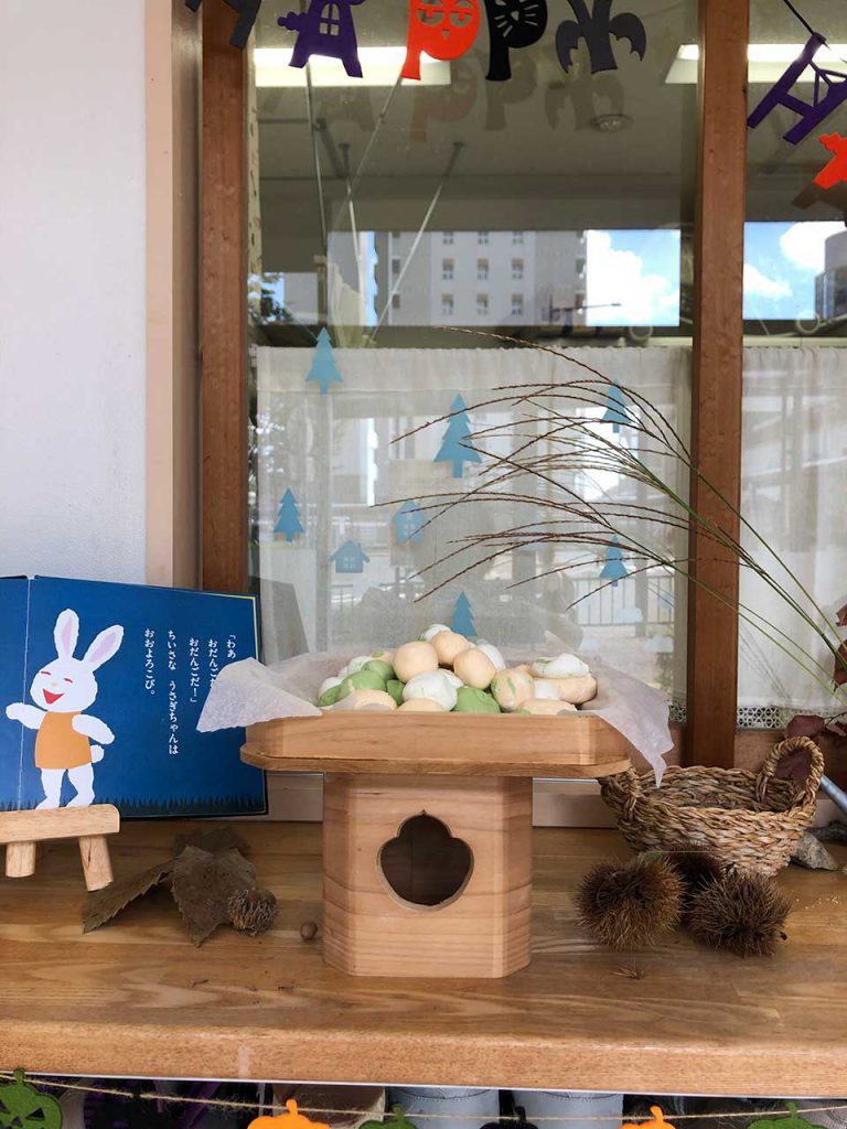食育で「きのこごはんづくり」と「お月見団子づくり」をしました。きのこごはんづくりでは、様々な種類のきのこを割いて割いて割いて・・・。うさぎぐみさんはお米を研いで炊く経験もしました。出来上がったきのこごはんは給食でいただき、パクパクよく食べる姿が見られました。お月見団子づくりでは、白玉粉から団子に変化する感触を楽しんだり、うさぎぐみさんは小松菜と人参で色付き団子を作りました。綺麗な緑とオレンジの色に興味津々だった子どもたち。団子が出来上がると、ススキを取りに山田道の入口までお散歩に行きました。