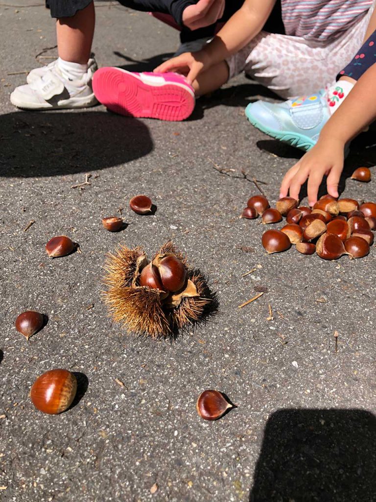 また、近隣の病院周辺にある栗の木を目指してお散歩に・・・。栗の木の下にたどり着くと・・・、「栗、あった!」と栗を発見。栗のいがが触れると痛いことを学びながら、栗をお土産にホクホク顔の子どもたちでした。
