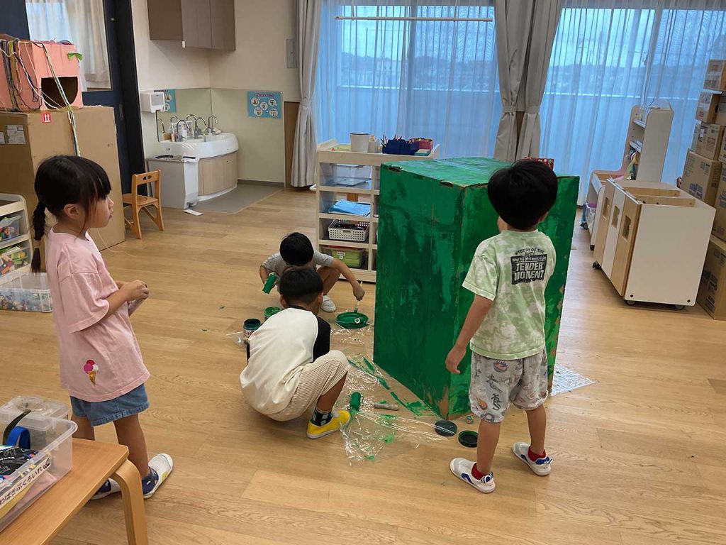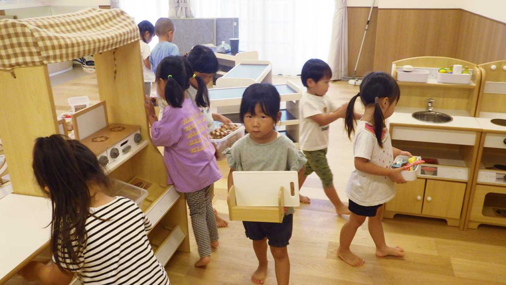 他クラスとのつながりを深める為、異年齢児交流を積極的に行っています。最初は、お互いに緊張した表情の子ども達も一緒に踊ったり、触れ合い遊びをしたりすることで、少しずつ距離が縮まり、「いっしょに あそぼー」と誘い合う姿が見られるようになってきました。日々の保育の中で、様々なクラスの子ども達が一緒に遊びお互いに刺激を受けながら楽しく過ごしています。今後も、異年齢児交流を通して相手を思いやる気持ちや、社会性を育んでいきたいと思っています。
