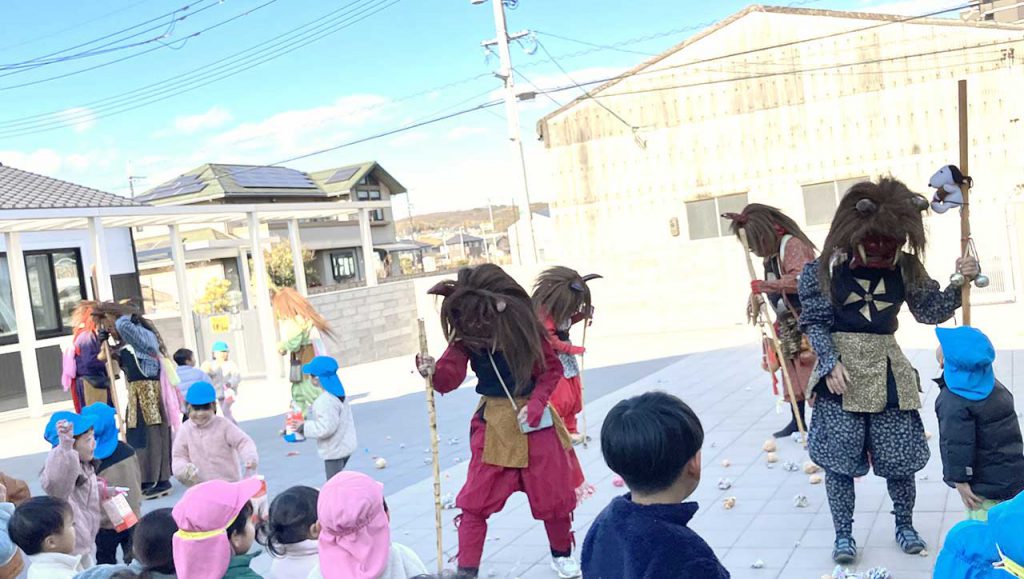 午後からは、早島町の「百鬼会」の方が来て下さり、豆まきもしました。4、5歳児は自分たちで作った鬼面や金棒、豆入れを持ちいざ出陣!「おには~そと ふくは~うち」と言いながら新聞紙で作った豆を鬼に向かって投げたり、ちょっぴり怖くて保育者の後ろに隠れたり、鬼と仲良くなりハイタッチしたり…と子ども達の反応は様々でしたが、楽しい節分となりました。