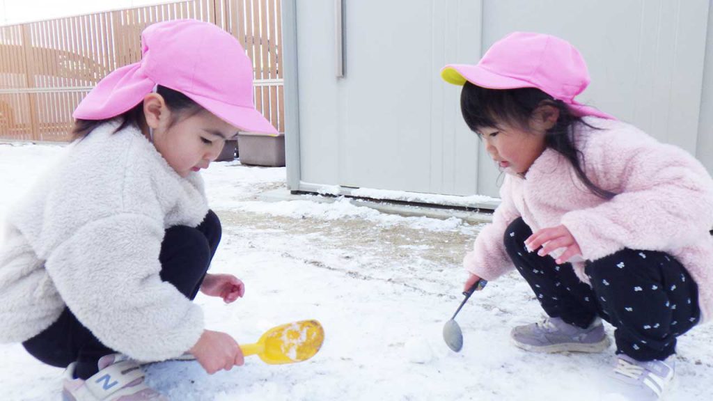 お玉やスコップを使って雪を集めて、雪だるまを作ってみるよ♪