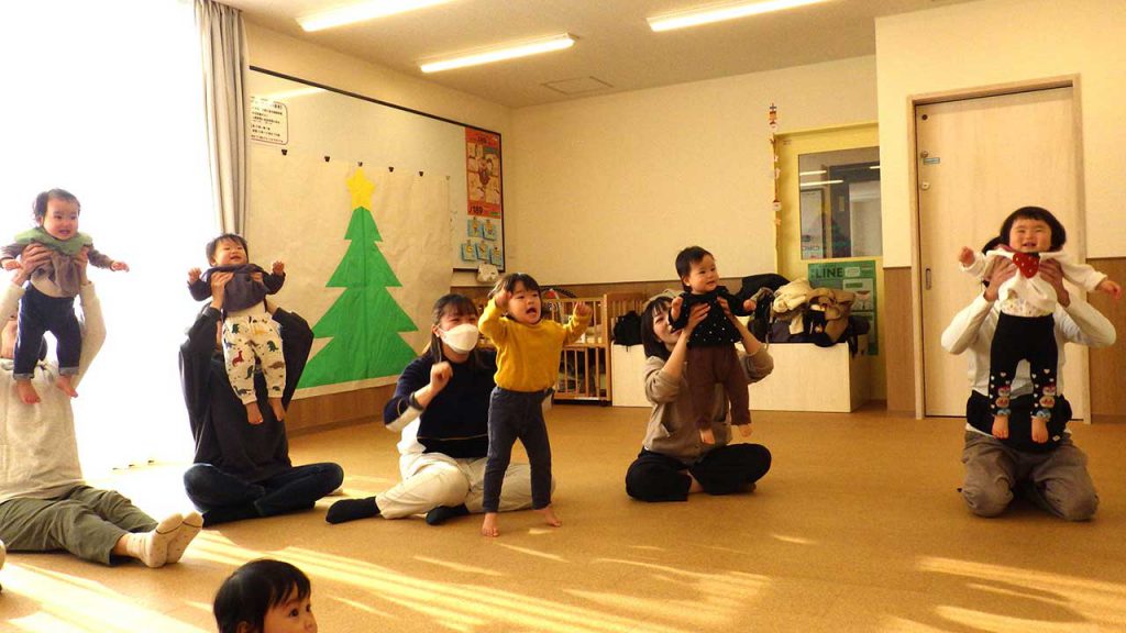 今回準備体操で「いち・にい・サンタ!」の絵本を用いて触れ合い遊びをしました。
