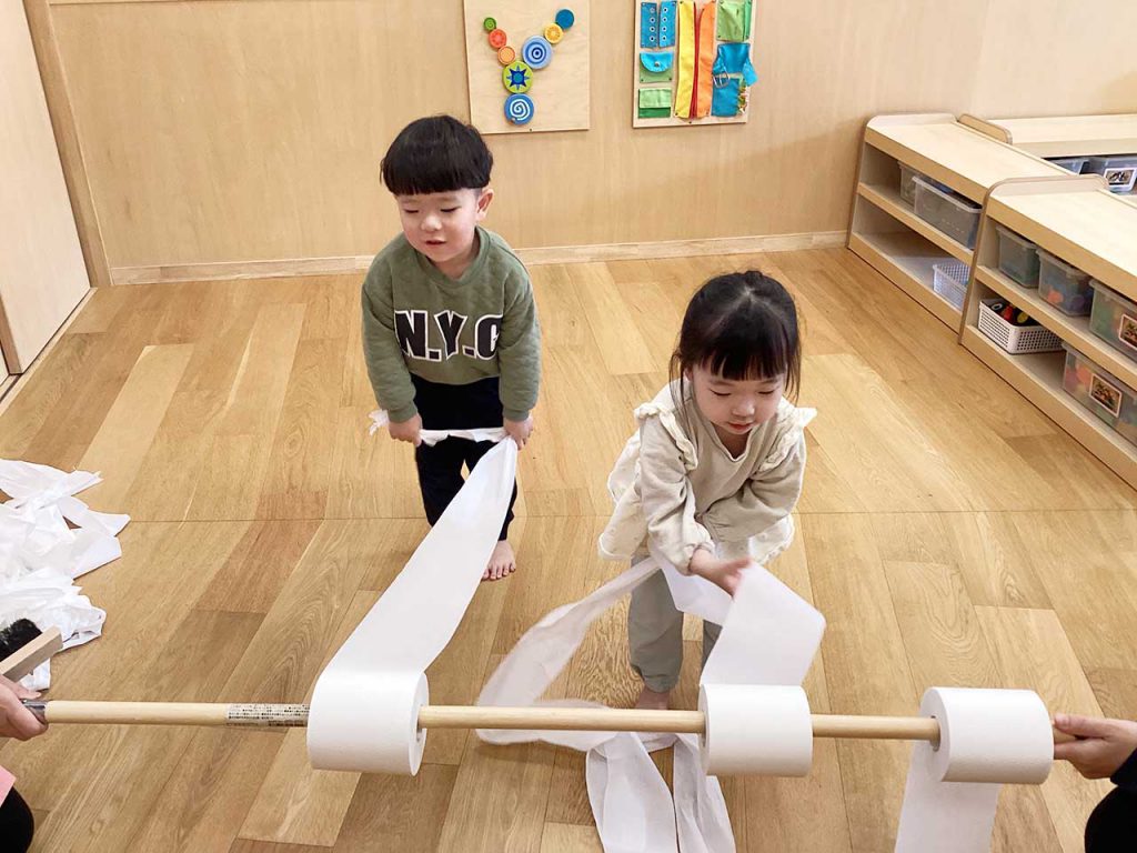 また、誕生会・ひな祭り会で3月生まれの誕生児をみんなでお祝いしたり、2歳児クラスではトイレットペーパーを使ってパルプ粘土を作り感触遊びをして楽しんだりと、進級を前に各クラスいろいろな活動を行い、賑やかで活気溢れる日々を送っています。
