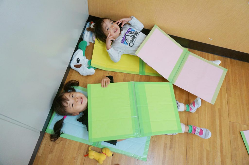 「おやすみなさい」ダンボールの仕切りを布団代わりにしておままごと中です。