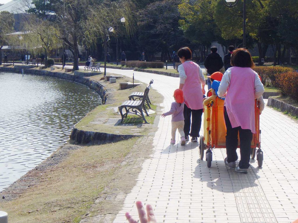 大濠公園までお散歩に行きました。池の水鳥を眺めたり、チューリップのつぼみをみて「もうすぐ咲くかな~」とお話が随分上手になってきた1歳児さんです。