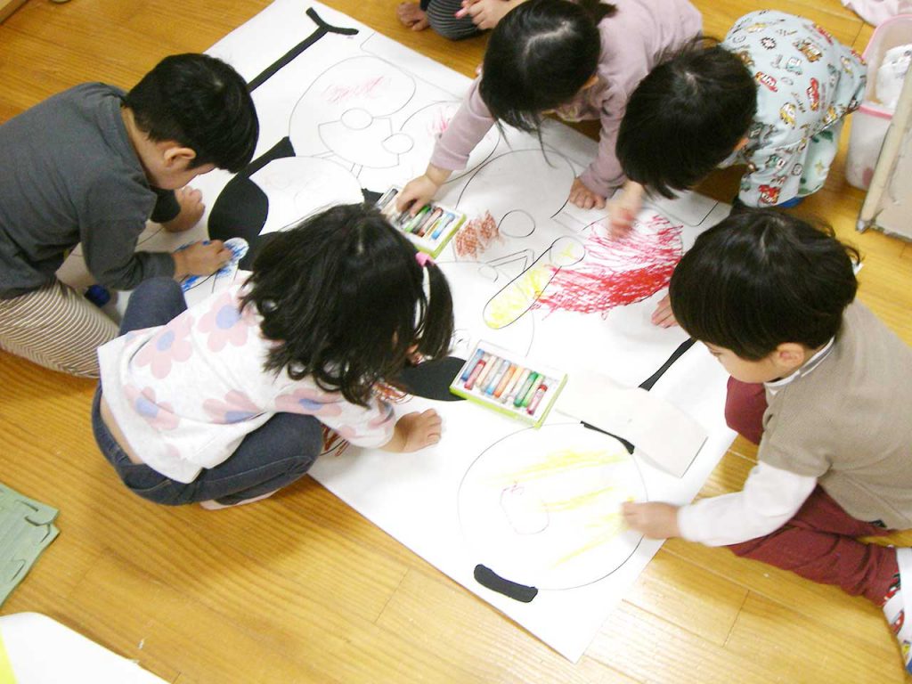 ひなまつりの製作で、お雛様とお内裏様にみんなで色付けをしました。大きな紙の上で腕を目一杯伸ばして大胆に書き上げていましたよ。