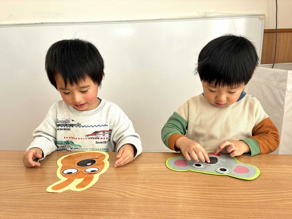 休み明けには、正月あそびをしました。こまや羽子板、福笑い、かるたなど、様々な伝承あそびを準備し、羽子板では、好きな色の羽子板を持ち、風船をポーンと何度も繰り返し楽しんでいました。また福笑いでは、みんなの大好きなキャラクターだったこともあり、「できた!」や「みて!」など保育者や友だちと出来上がった顔を見せ合い喜んでいました。それぞれ個性豊かな顔ができ、とても可愛かったです。