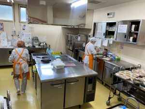 給食室には2名の社員と2名の非常勤がおり、午前中は基本3名体制で調理を行っています。