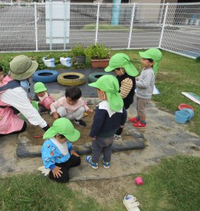 園の横に小さい園庭があり野菜や植物を育てお子様と一緒に観察したり、夕方は保護者様が来るまで外遊びする事ができる環境です。